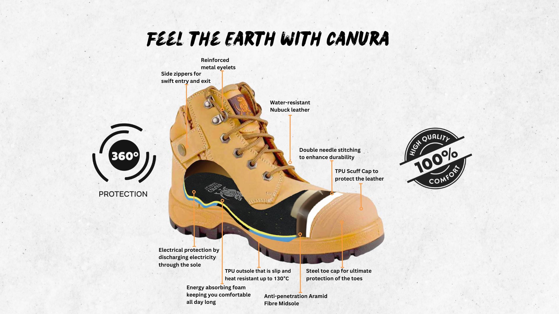 - Steel toe cap for foot protection , shielding toes from heavy impacts, compression along with a TPU scuff cap to shield the leather.