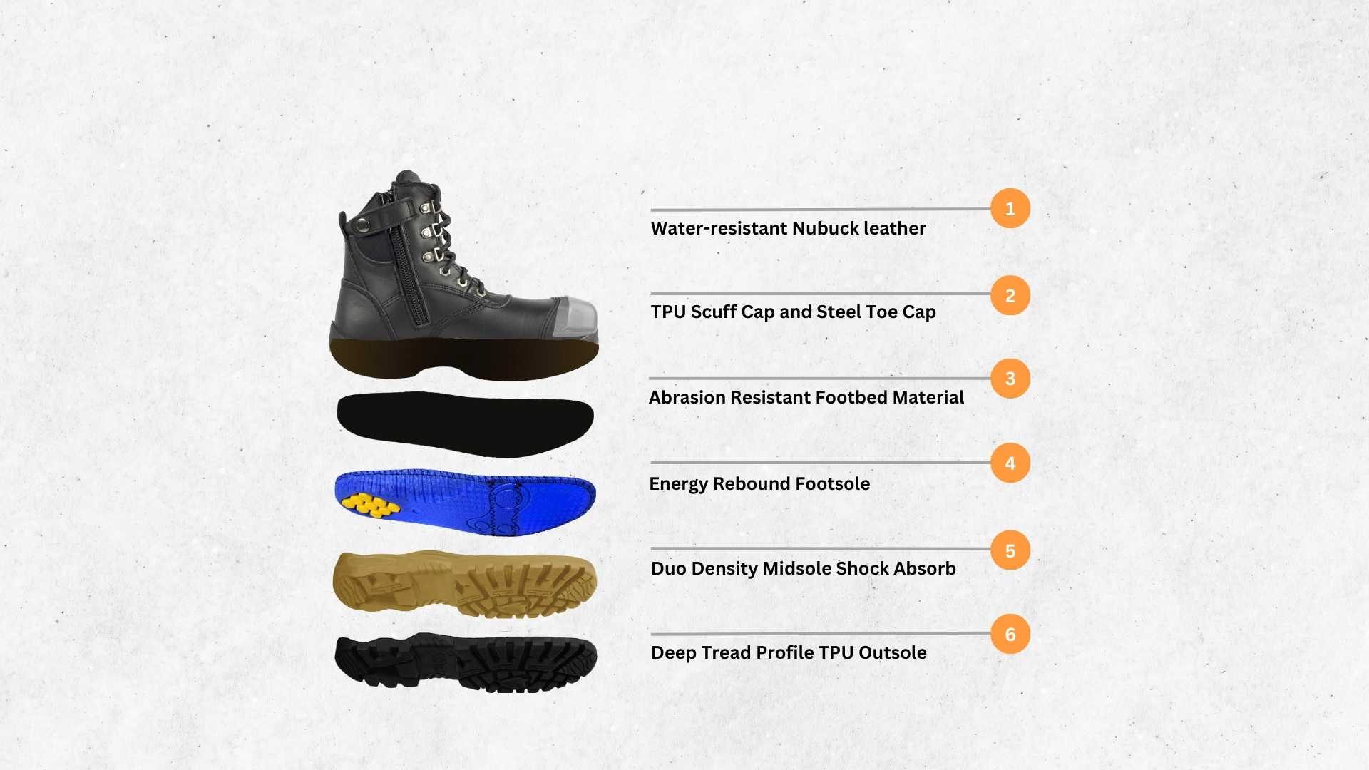 - Steel toe cap for foot protection , shielding toes from heavy impacts, compression along with a TPU scuff cap to shield the leather.